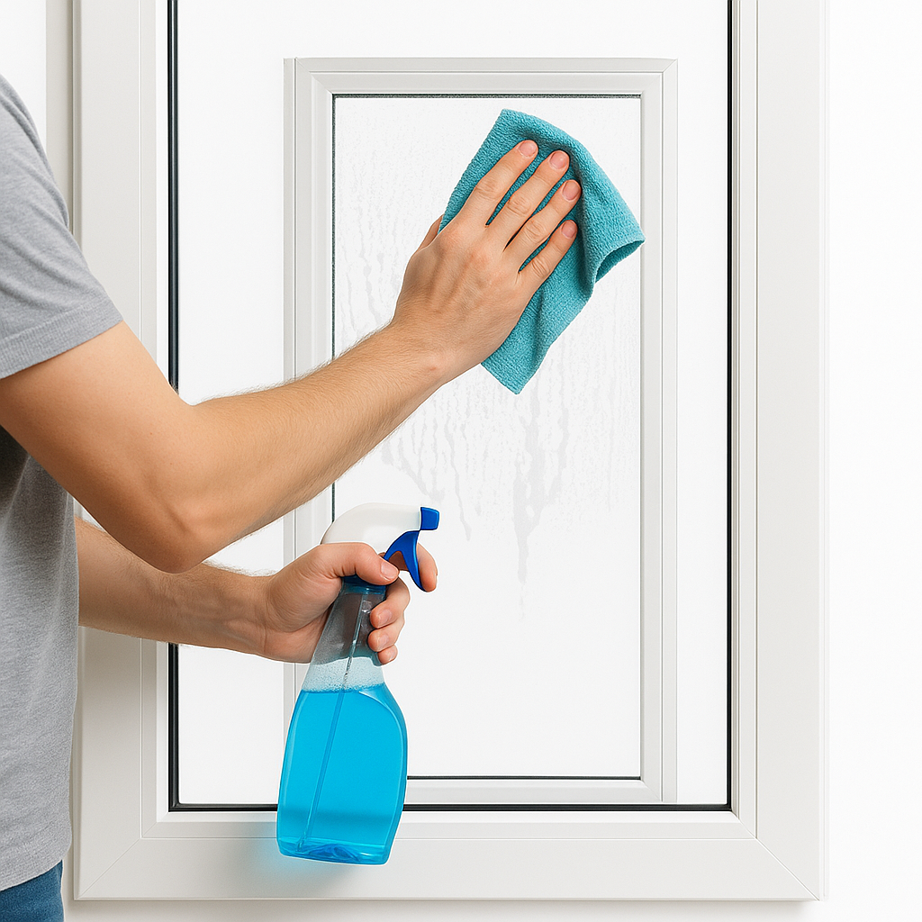 Nutze einen schlierenfreien Glasreiniger, sparsame Dosierung und ein Mikrofasertuch oder einen Abzieher. Nicht in direkter Sonne arbeiten, damit nichts antrocknet.