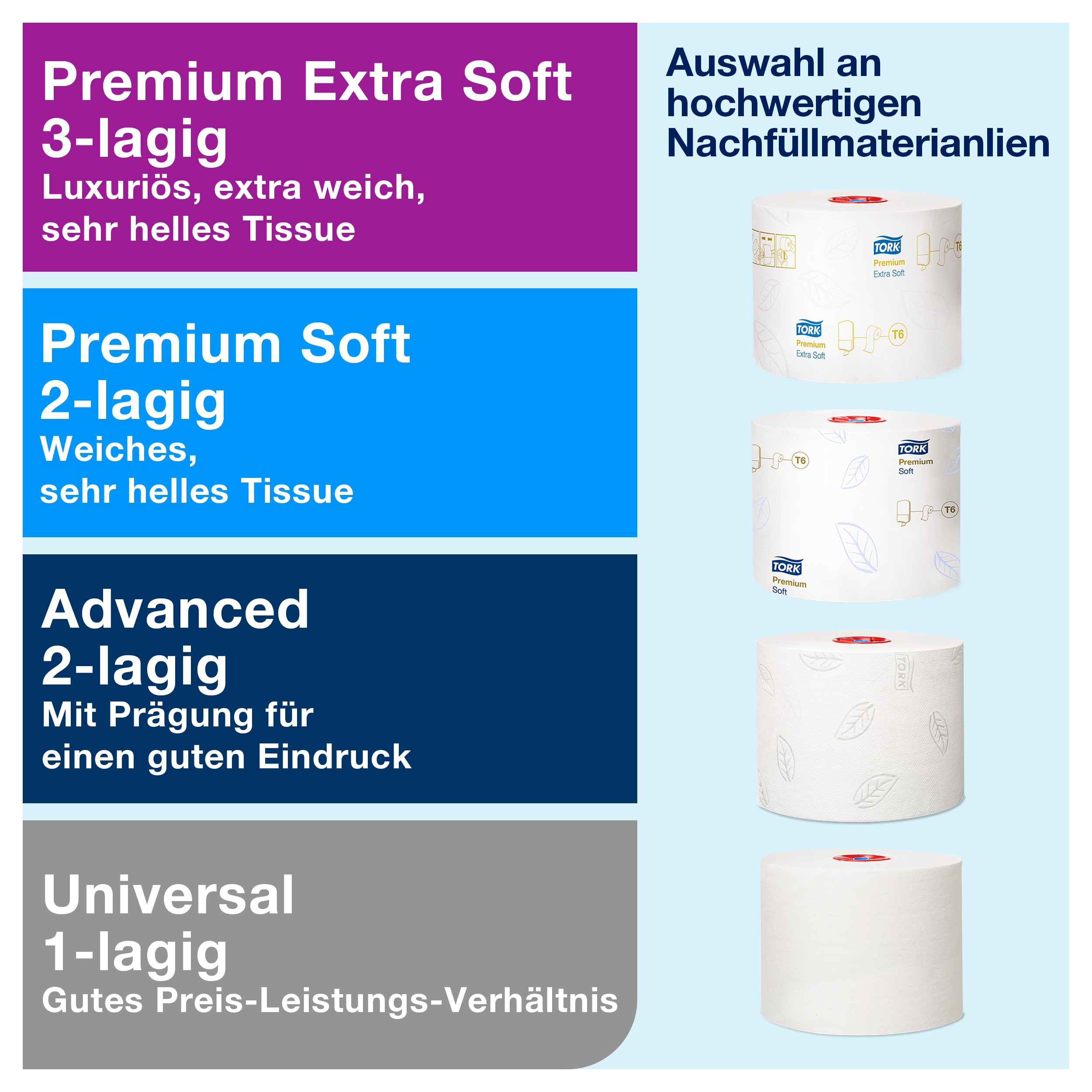 Kompatibel mit allen Tork T6 Midi-Toilettenpapierrollen in Advanced- oder Universal-Qualität.