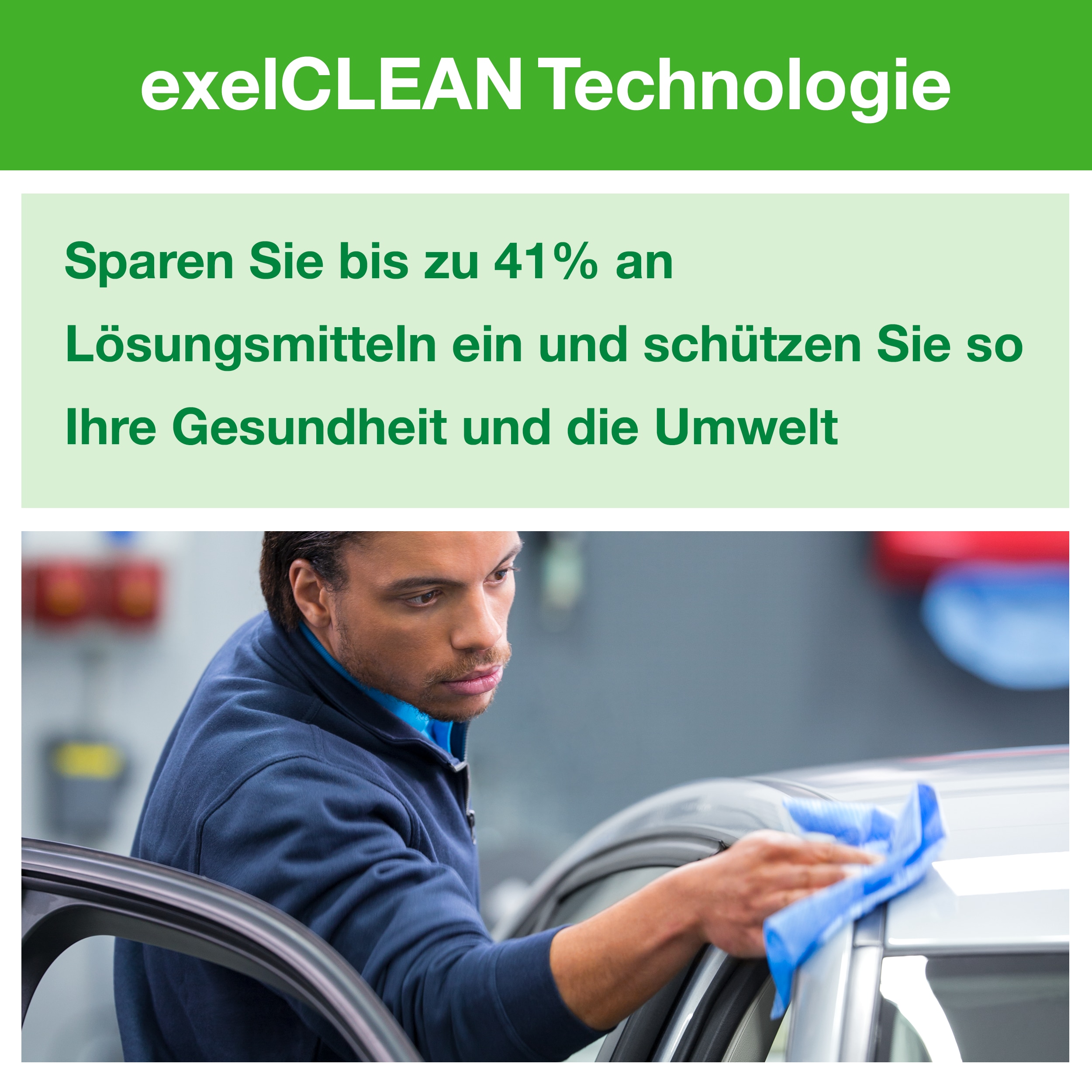 Das exelCLEAN® Material ermöglicht bis zu 41 % weniger Lösungsmittelverbrauch und reduziert Abfall deutlich. Seit 2011 wurden die CO₂-Emissionen dieser Tücher um 28 % gesenkt (LCA Essity & IVL).