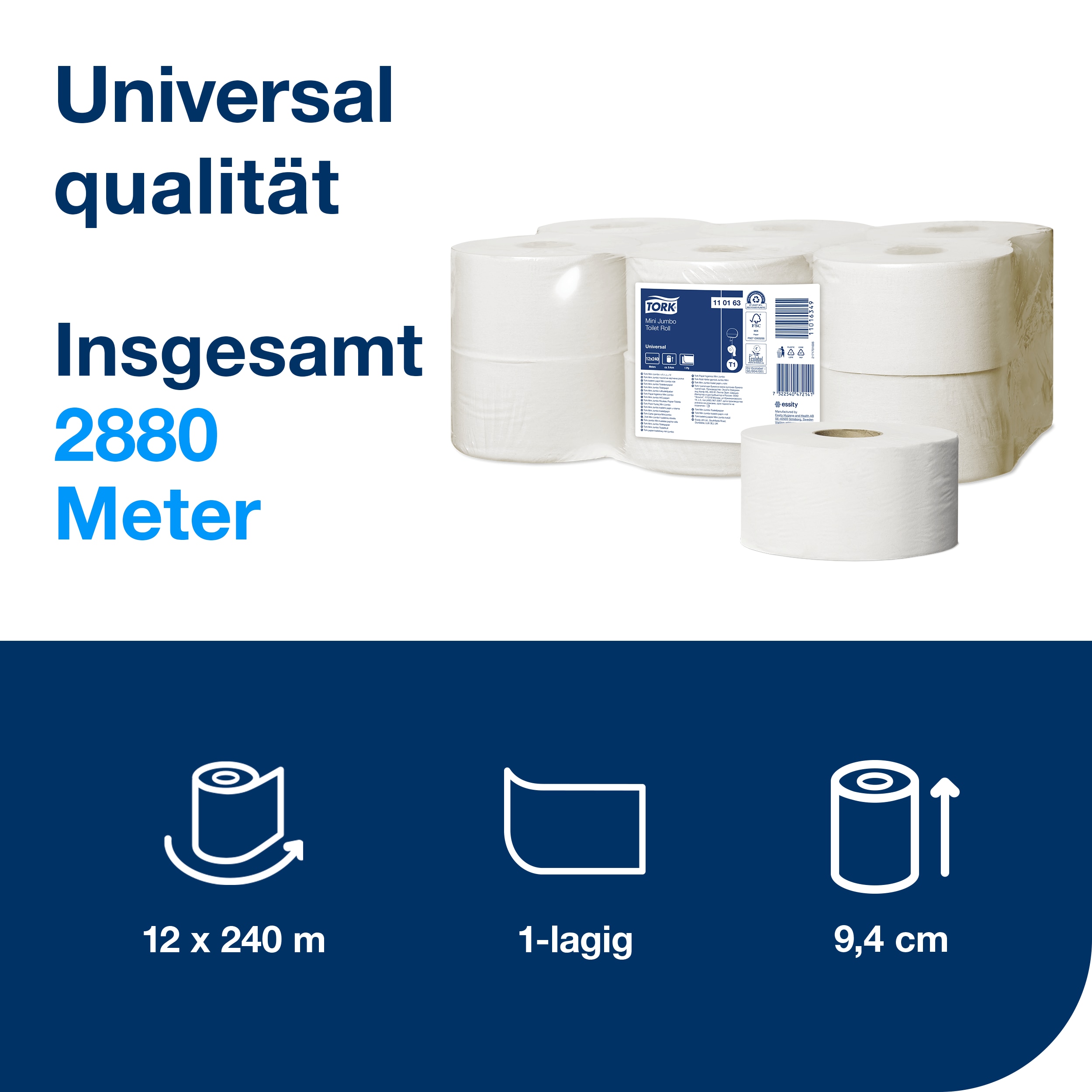 Tork Mini Jumbo Toilettenpapier Advanced T2 überzeugt durch ein hervorragendes Preis-Leistungs-Verhältnis und eine besonders hohe Kapazität. Mit 240 Metern pro Rolle müssen Ihre Mitarbeiter seltener nachfüllen – das spart Zeit und verhindert Papierengpässe in stark frequentierten Waschräumen.