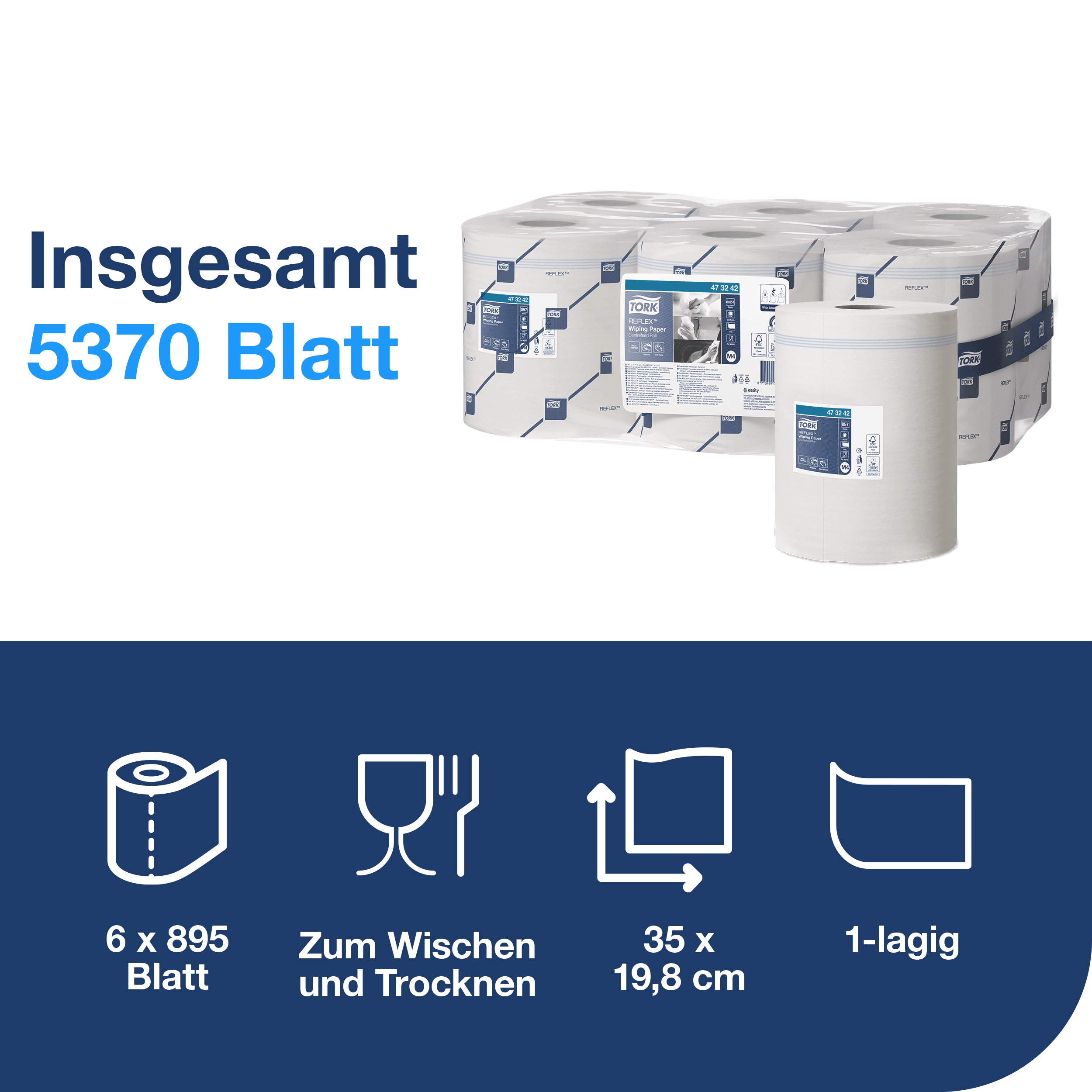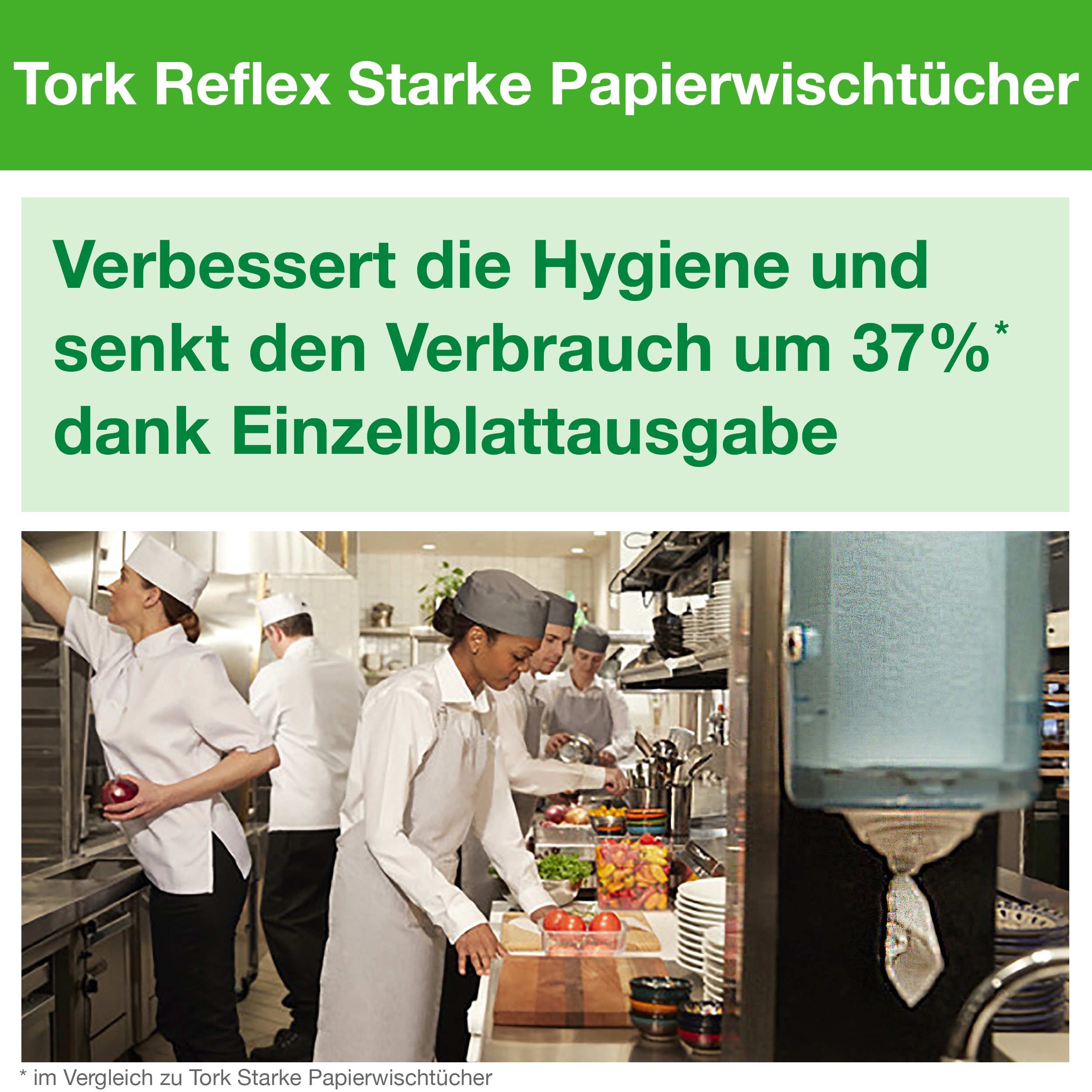 Perfekt für Betriebe, die lebensmittelsichere Papierwischtücher mit Einzelblattentnahme suchen. Die Tork Reflex™ M4-Rollen sparen bis zu 37 % Papierverbrauch gegenüber offenen Systemen – für mehr Effizienz und Sauberkeit in Küche, Produktion oder Werkstatt.
