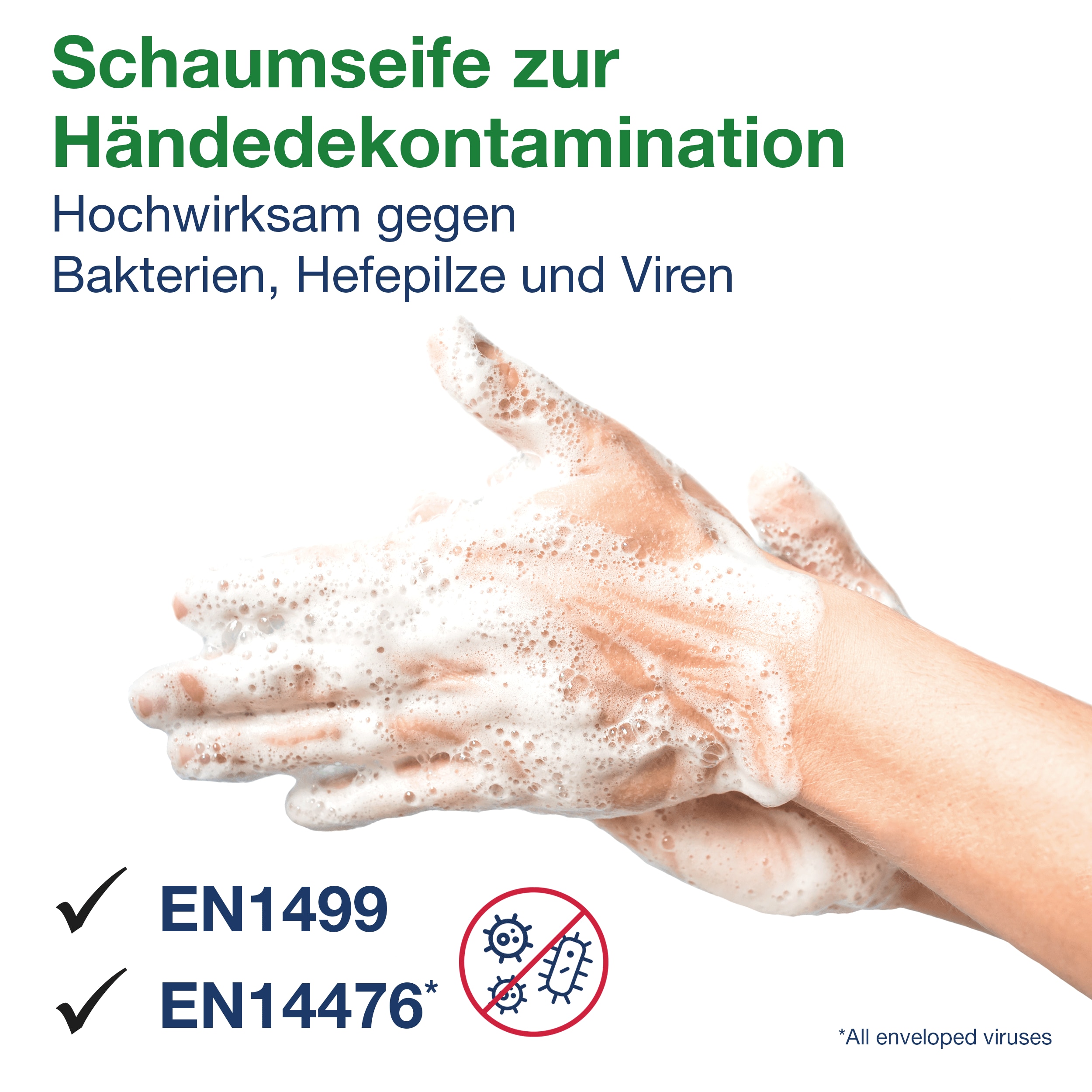 - ✓ Wirksam gegen Bakterien, Viren und Hefepilze (EN 1499, EN 13624, EN 14476)