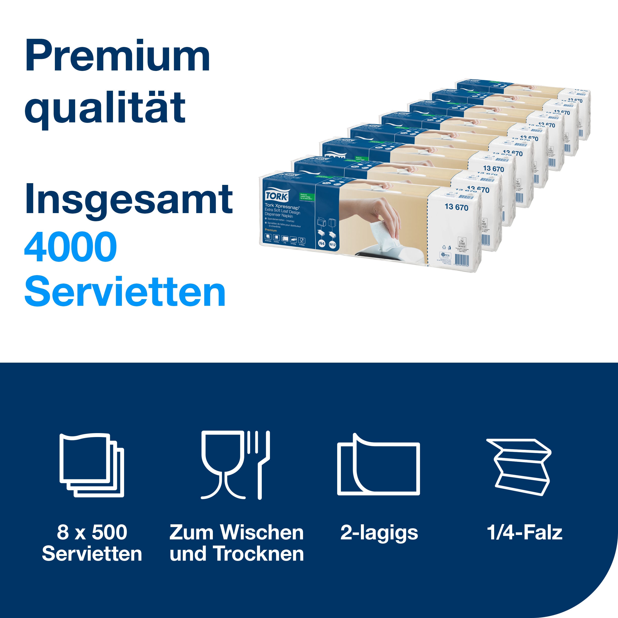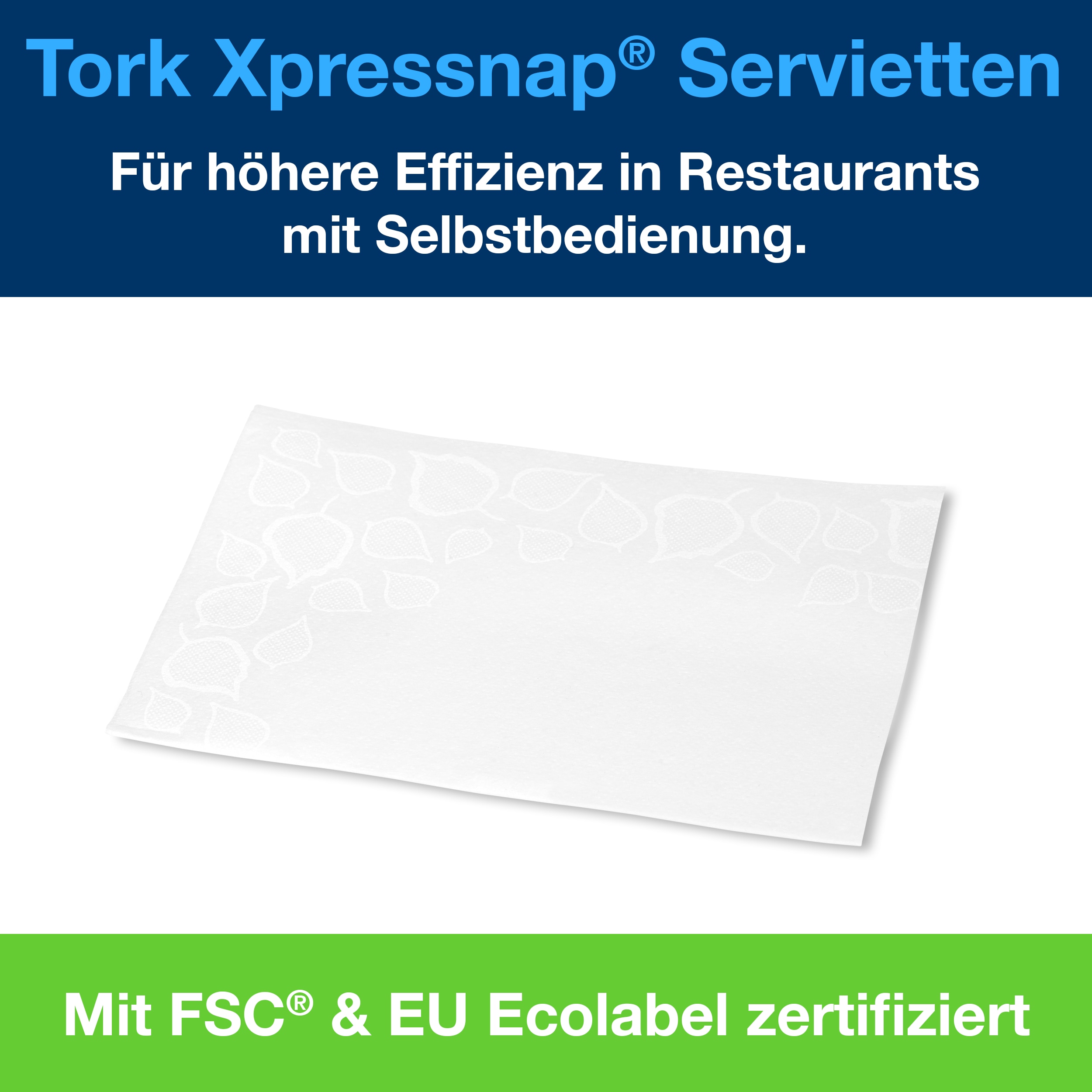 Die Tork Xpressnap® Spenderservietten Premium N4 sind die ideale Lösung für Selbstbedienungsrestaurants, Cafés und Schnellgastronomie. Durch das innovative Einzelblatt-Entnahmesystem wird der Verbrauch um mindestens 25 % reduziert – das senkt Ihre Kosten und den Abfall.