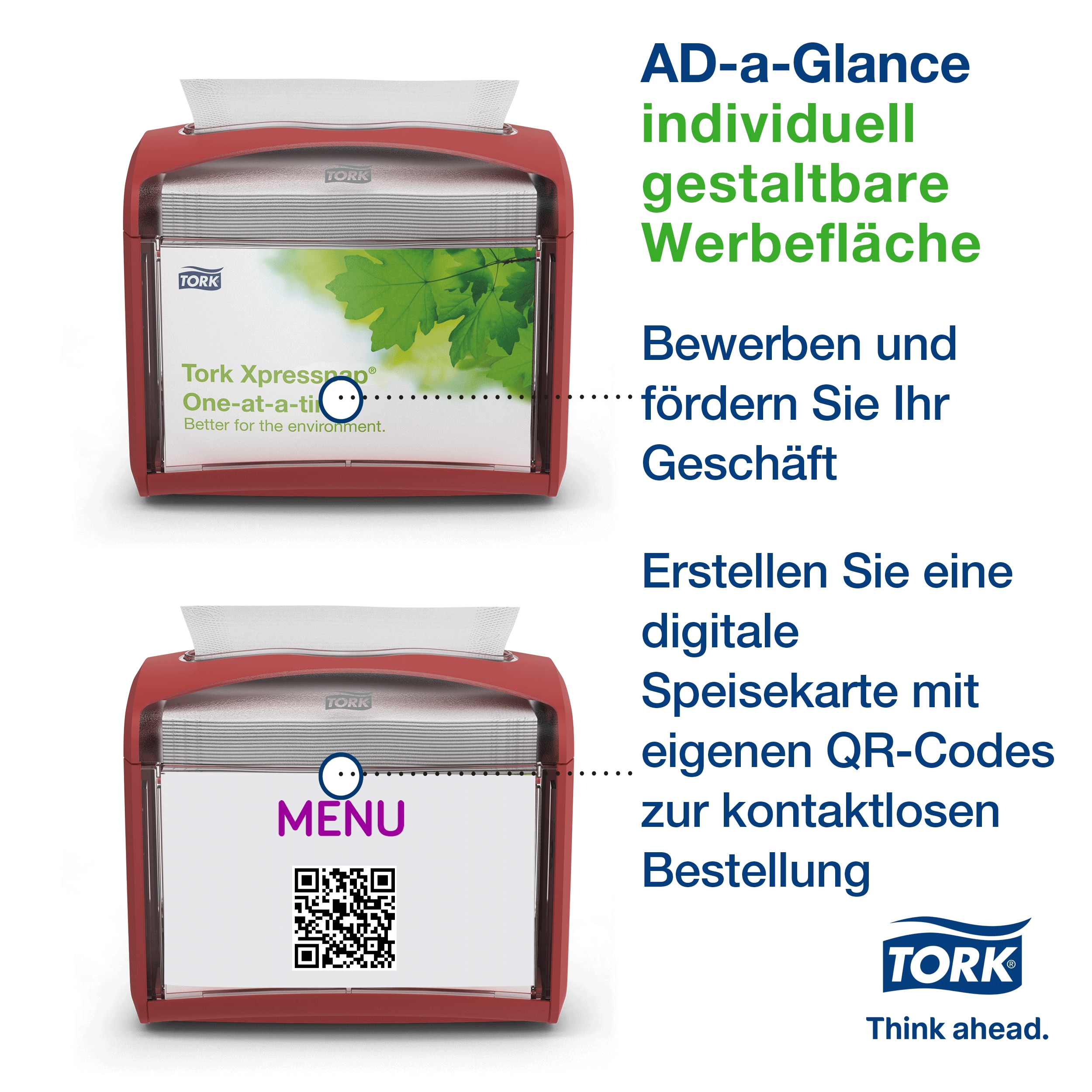 Durch die reduzierte Einzelnutzung und das robuste Design wird Abfall minimiert und die Lebensdauer des Spenders verlängert. Das AD-a-Glance® Display ermöglicht zusätzliche Kommunikation oder Werbung am Tisch – eine praktische Kombination aus Funktion und Marketing.