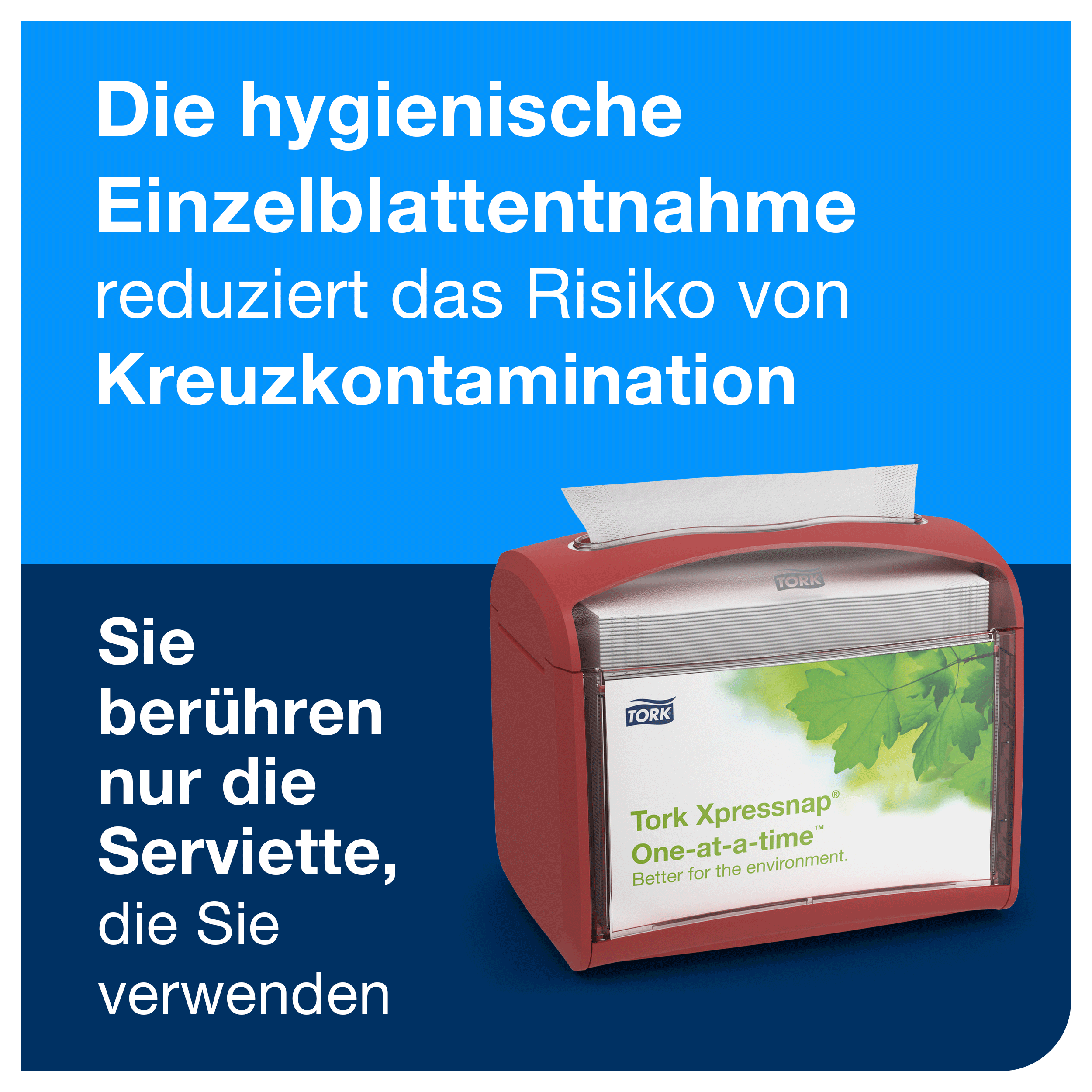 Der Tork Xpressnap® N4 Spender gibt nur eine Serviette pro Zug aus – das senkt den Verbrauch und verbessert die Hygiene am Tisch.