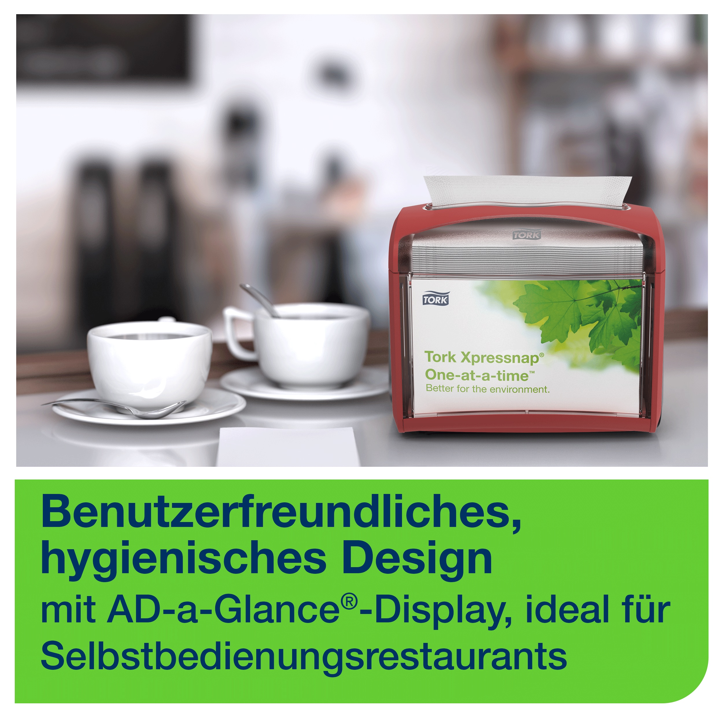 Perfekt für Unternehmen, die nach Serviettenspendern für Restaurants mit Selbstbedienung oder hygienischen Tischspendern mit Einzelblattausgabe suchen. Der Tork Xpressnap® N4 reduziert den Verbrauch und bietet gleichzeitig ein ansprechendes Design für moderne Gastronomiebetriebe.