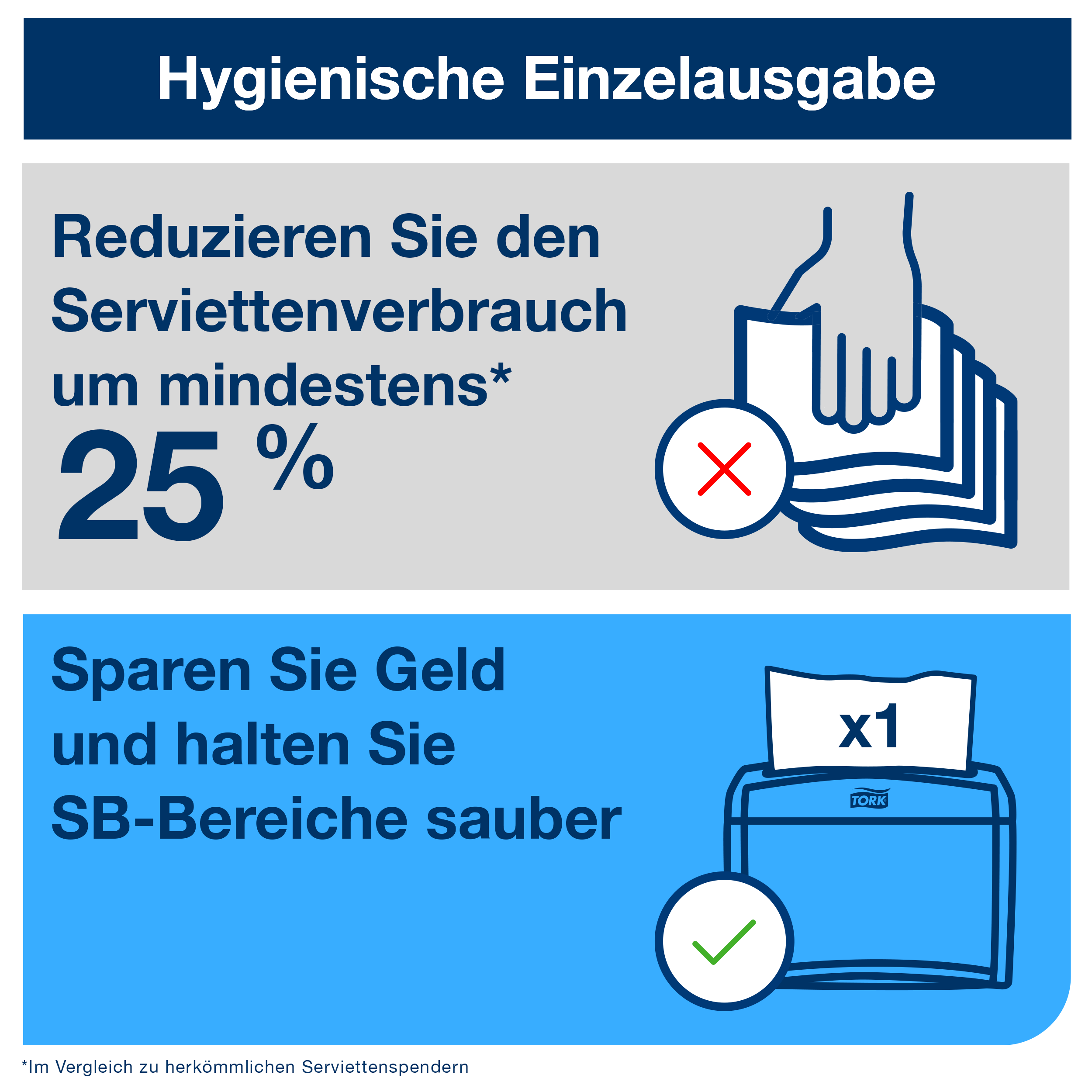Der Tork Xpressnap® Tischspender N4 aus der Signature Line sorgt für mehr Hygiene und Kosteneffizienz in Restaurants, Cafés und Selbstbedienungsbereichen. Dank der Einzelblattausgabe reduziert sich der Serviettenverbrauch um mindestens 25 %, während Gäste nur ihre eigene Serviette berühren – für ein sauberes, professionelles Erscheinungsbild.