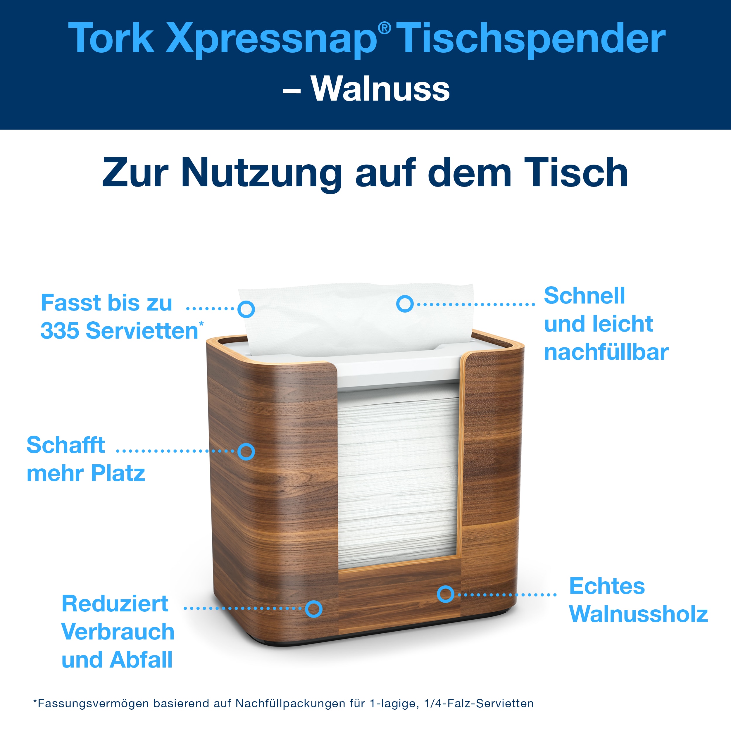 Mit dem Tork Xpressnap® Tischspender Walnuss setzt du auf Design, Hygiene und Wirtschaftlichkeit. Jetzt bestellen → elegant, langlebig & effizient.