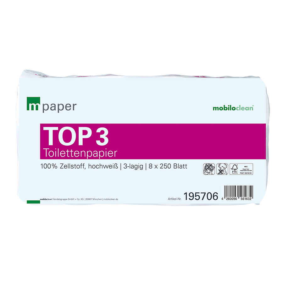 Mit 3-lagiger Verarbeitung, hochweißer Optik und zertifizierter Zellstoffqualität ist das mpaper Toilettenpapier Top³ eine professionelle Wahl für anspruchsvolle Anwender.